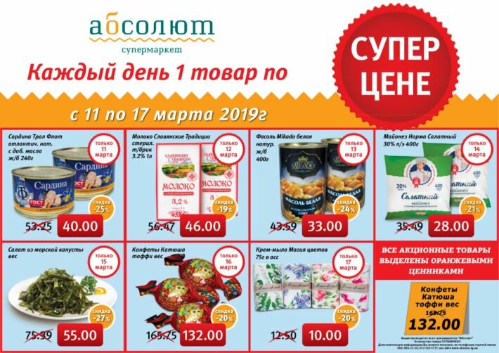 Сеть Супермаркетов Абсолют, предлагает вам каждый день 1 товар по супер цене!